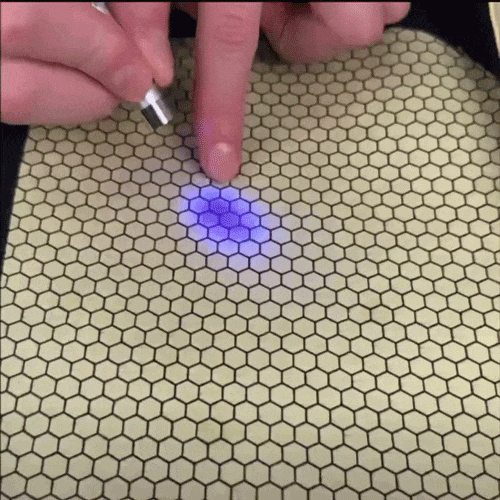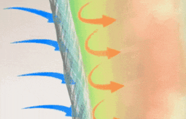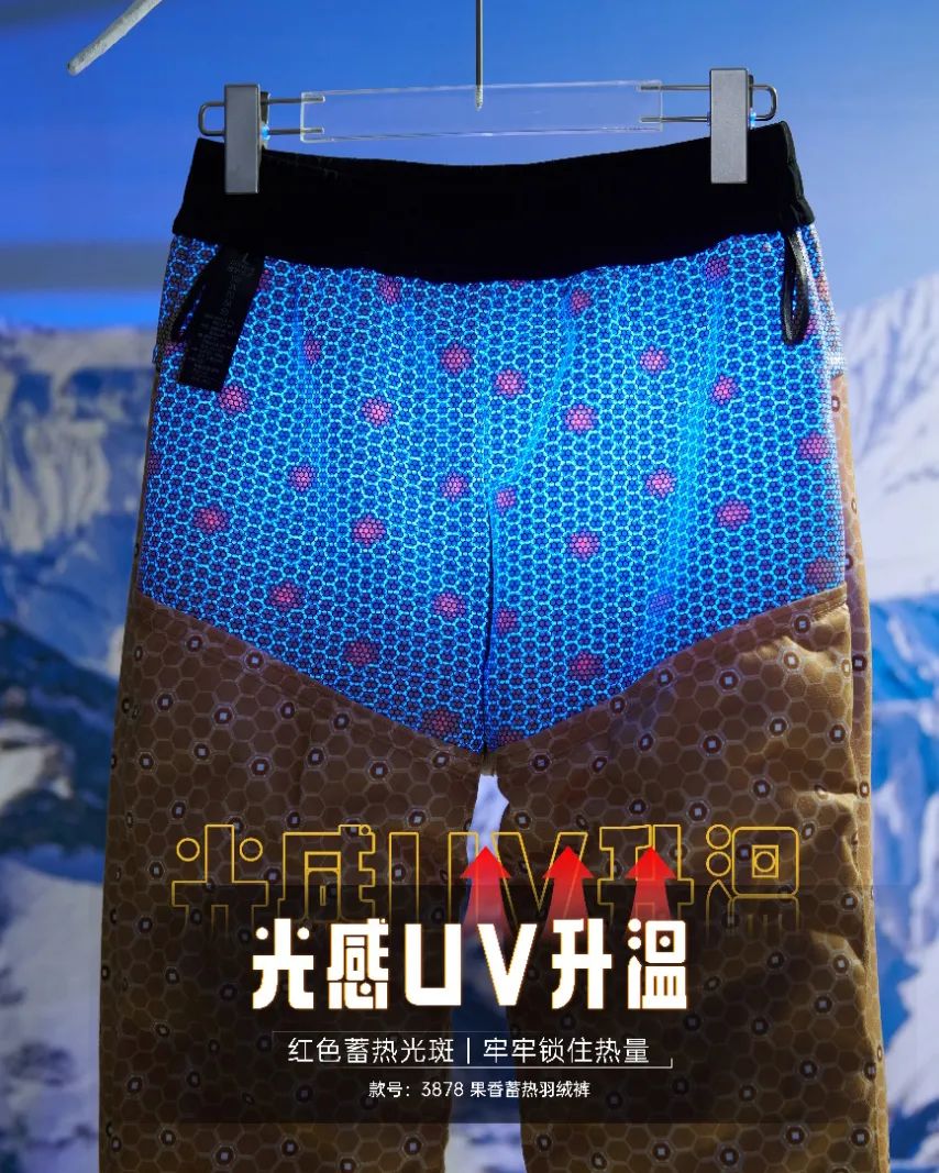 大家可以看到,在紫外线的作用下,智能调节面料内部的保暖结构,形成红色的蓄热光斑,能有效阻止热量流失。
