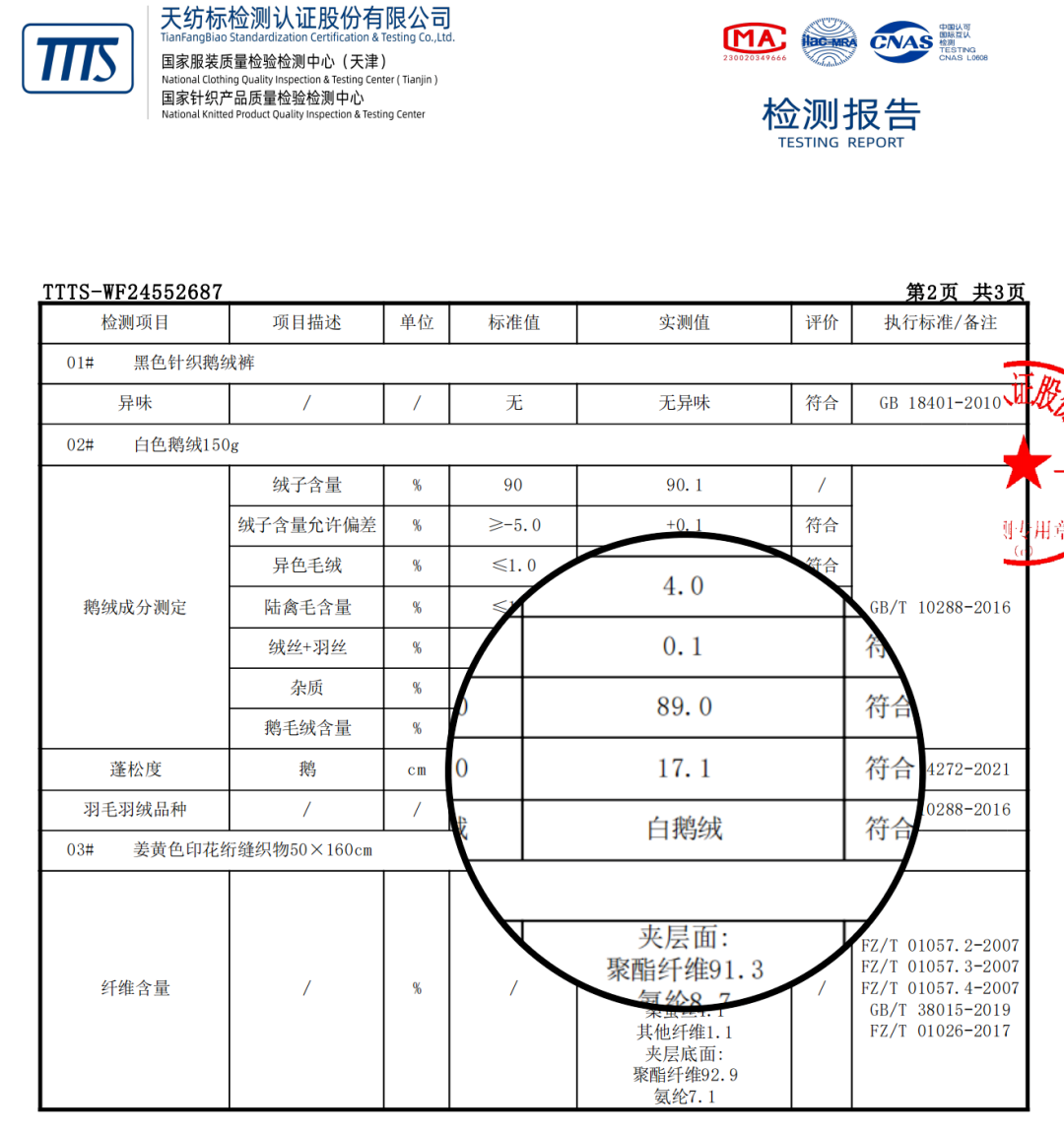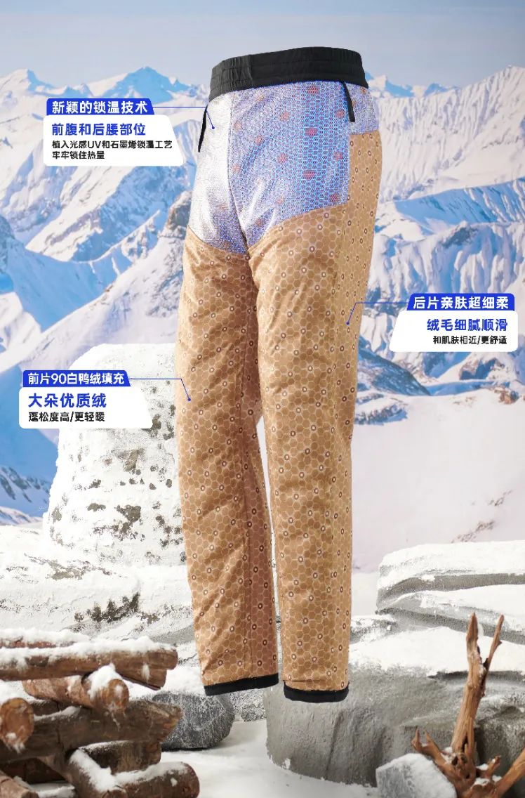 鹅绒裤和上面介绍的鸭绒裤,在版型、表层防水以及温感技术方面都大同小异。重点看下它的填充,选用的是新国标90%鹅绒。
