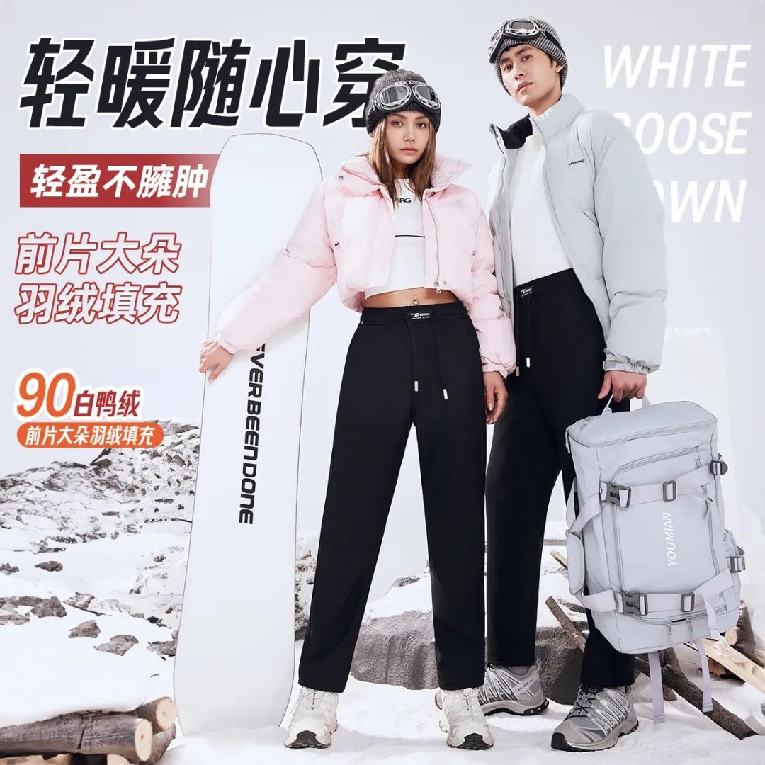 这款白鸭羽绒裤经过多次打版,和普通的羽绒裤相比,没有膨胀感。