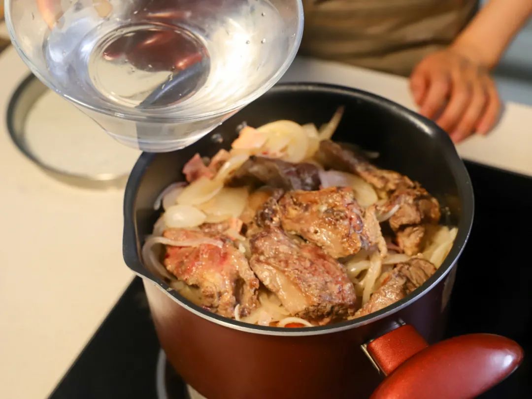 9.倒入煎好的牛肋条,加500毫升的水,加盐和胡椒调味,开始焖煮的过程