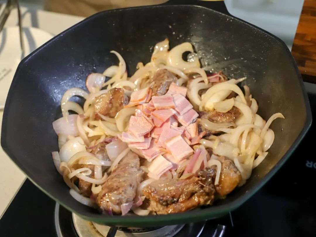 6.放入培根碎,洋葱丝,搅拌洋葱至焦糖色