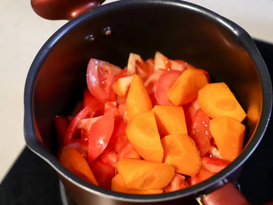 8.准备一个炖锅,倒入番茄和胡萝卜。
