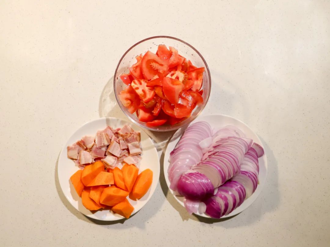 1.准备配菜:西红柿胡萝卜切块,尽量大一些,洋葱切丝,培根切碎