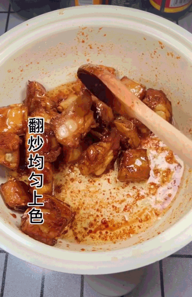 2.酱排骨捞出放入冷水中洗一下,备用。锅中放油,加入20g冰糖,冰糖熬成枣红色倒入排骨。