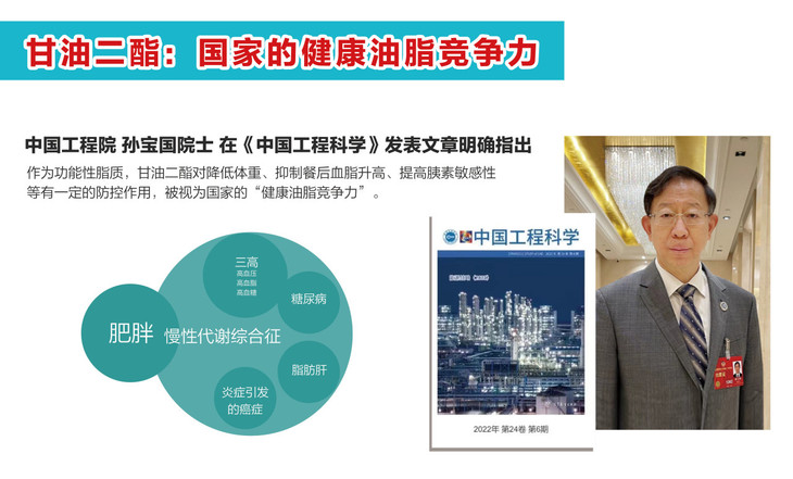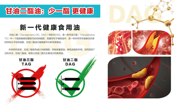 甘油二酯,(Diacylglycerol) 简称为DAG,微量存在于植物油中,是一种自然存在健康且珍贵的分子结构特别的油脂,是公认的GRAS食品成分,甘油酯油已被列为新资源食品。大部分传统食用油中约95%以上为甘油三酯,甘油二酯 (DAG) 含量非常少。甘油三酯摄入过量容易引起脂肪堆积,而二酯油的分子结构和代谢方式不同则不易堆积。