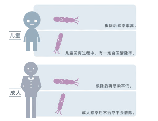 儿童HP感染者发生严重疾病的几率很低,大部分感染HP后没有明显症状,少部分有腹部不适,如恶心、呕吐、返酸等消化道症状。 儿童HP感染根除后再感染率可能较高;而成人真正根除后,再感染率较低。