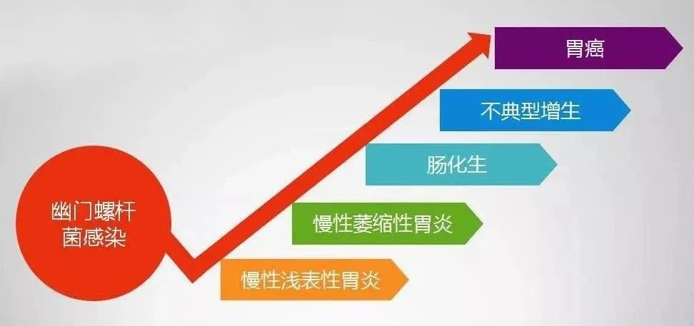 除了胃癌,幽门螺杆菌还能引起多种胃病。 几乎所有Hp感染者都有胃炎,主要可分为非萎缩性胃炎、萎缩性胃炎、淋巴细胞性胃炎等。其中,1%会转变为胃癌。 国际学术界公认胃炎癌变过程为:慢性胃炎—萎缩性胃炎—肠上皮化生—不典型增生—癌变。 Hp感染者中,大约15%~20%会患上胃溃疡、十二指肠球部溃疡等疾病。 约1%的Hp感染者会发生胃癌、胃黏膜相关淋巴组织淋巴瘤。 增生性胃息肉、胃黏膜肥大症等非常见胃病,以及缺铁性贫血、血小板减少症、维生素B12缺乏症等胃外疾病。