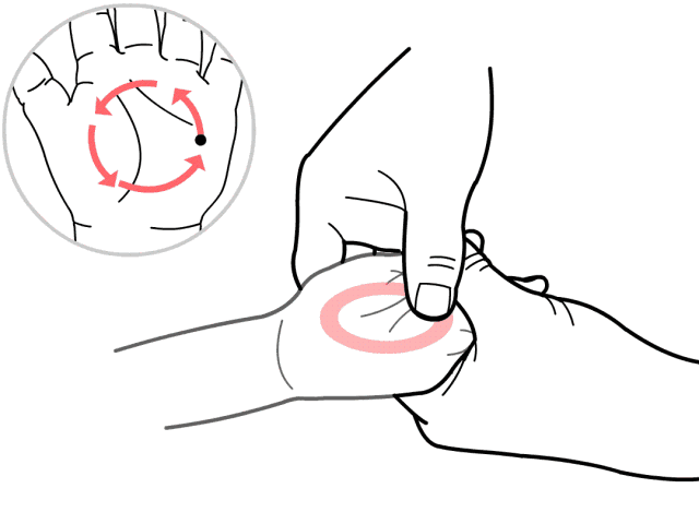 两手伸直,掌心相对,平托于胸前,用右手拇指,从左手中指末端,沿手掌中线推移,至肘窝中点,做25次,反复即可。这样做有助于充分激活心脏的保护神—心包经和心经,促使经络畅通,心血充盈。