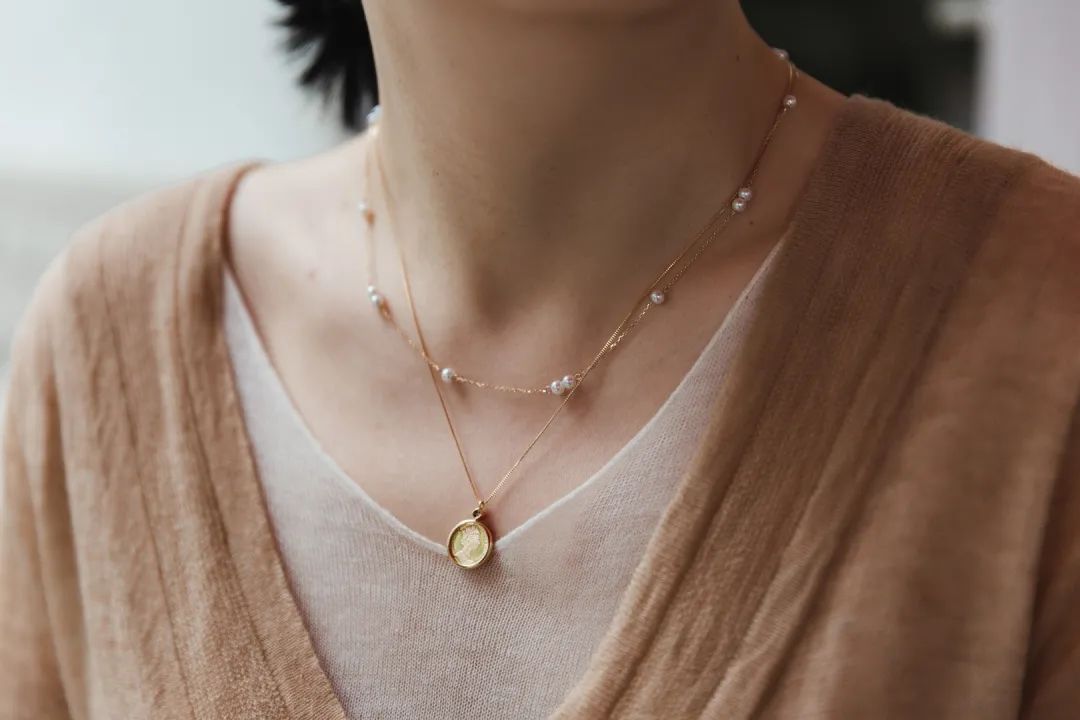 若有若无的锁骨链,超级好搭配。纯18k金链,手工制作,珍珠顶级珠光淡水,正圆无暇高光,珠光胜过普通的akoya,非常精美。珠子3-4mm左右,每一/两粒珍珠都用纯手工绕了一个金圈,固定了珍珠,非常精致。也十分考验手工。我们完成的很漂亮。