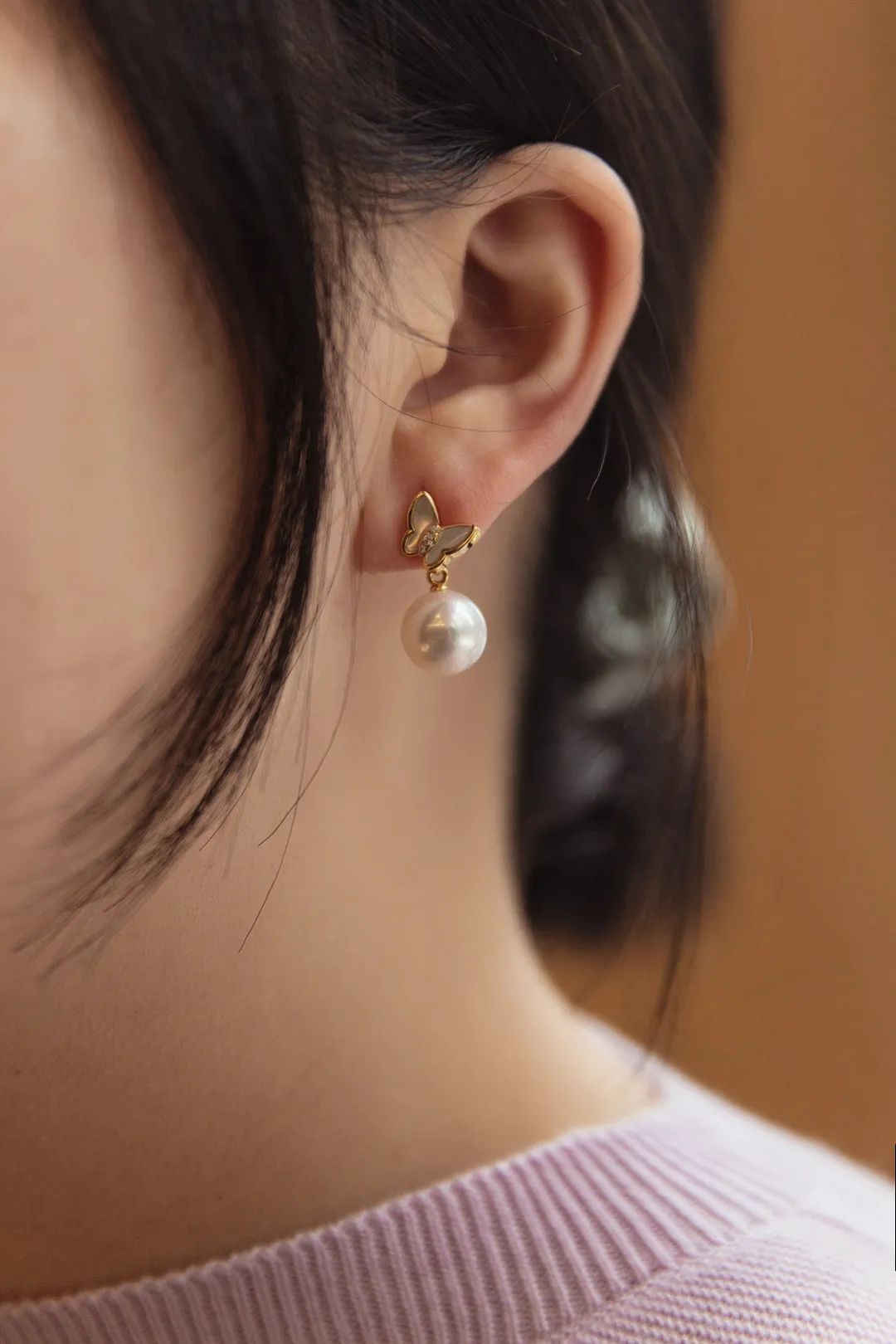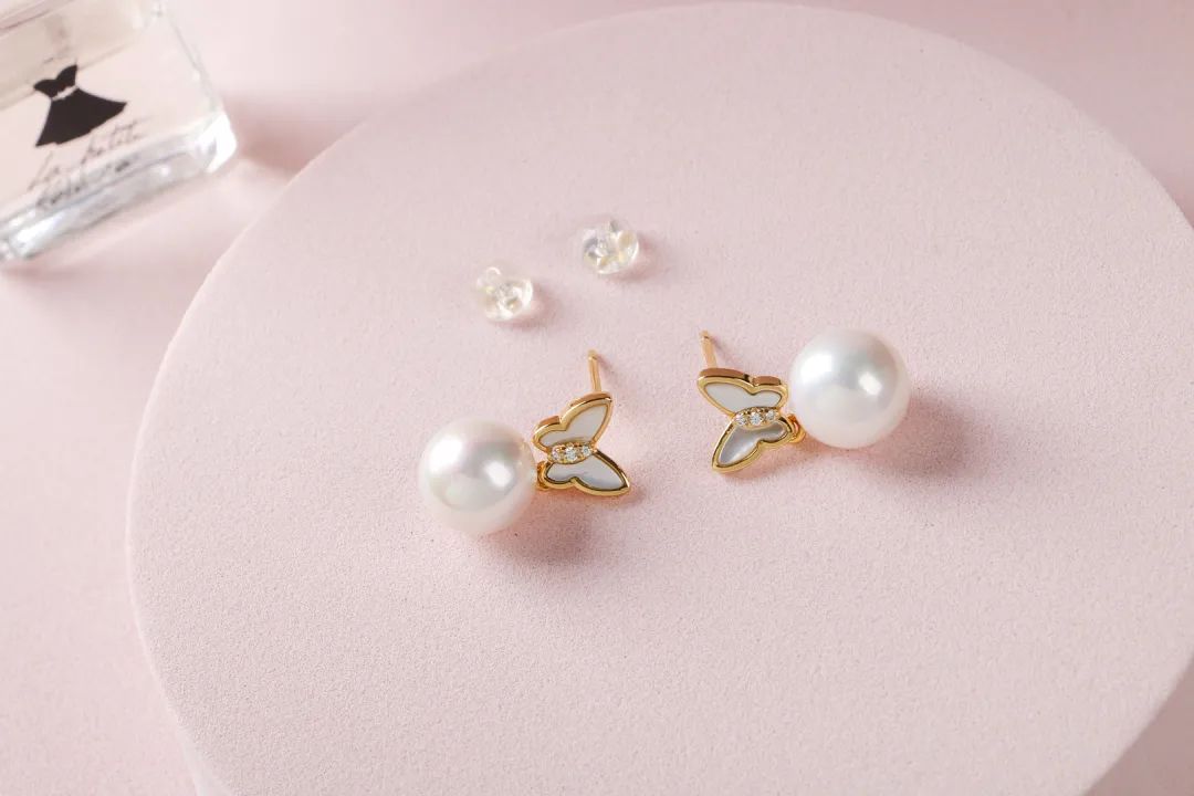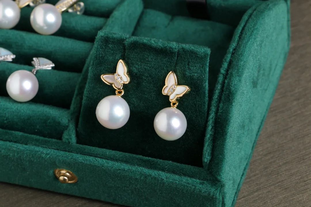 蝴蝶款选用珠光很亮,整体视觉效果类似澳白的10-11淡水珍珠。正圆度完美,珠光十分漂亮,瑕疵上不多,轻微生长痕迹,由于珠光很亮的关系,可以忽略。很漂亮。