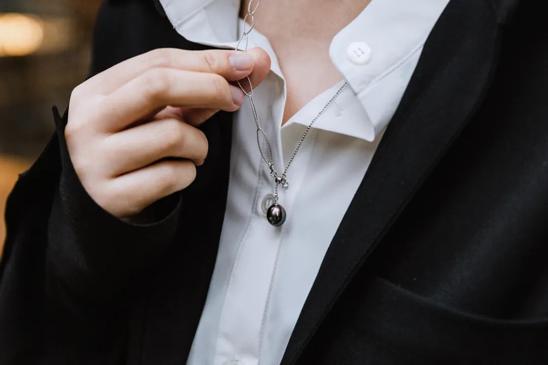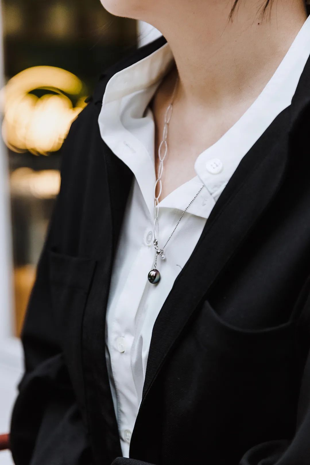 大溪地水滴恋随款,用独特少见的珠色,孔雀绿+孔雀紫色大溪地珍珠,及美妙的炫光,微妙的串连方法,令一条就能点亮造型,干净的衬衫,西装裤,搭配这条就可以了。