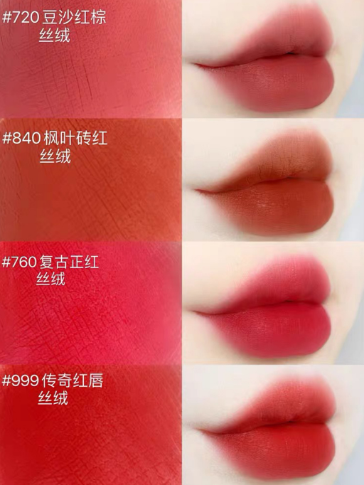 #720豆沙红棕丝绒、#840枫叶砖红丝绒、#760复古正红丝绒、#999传奇红唇丝绒!