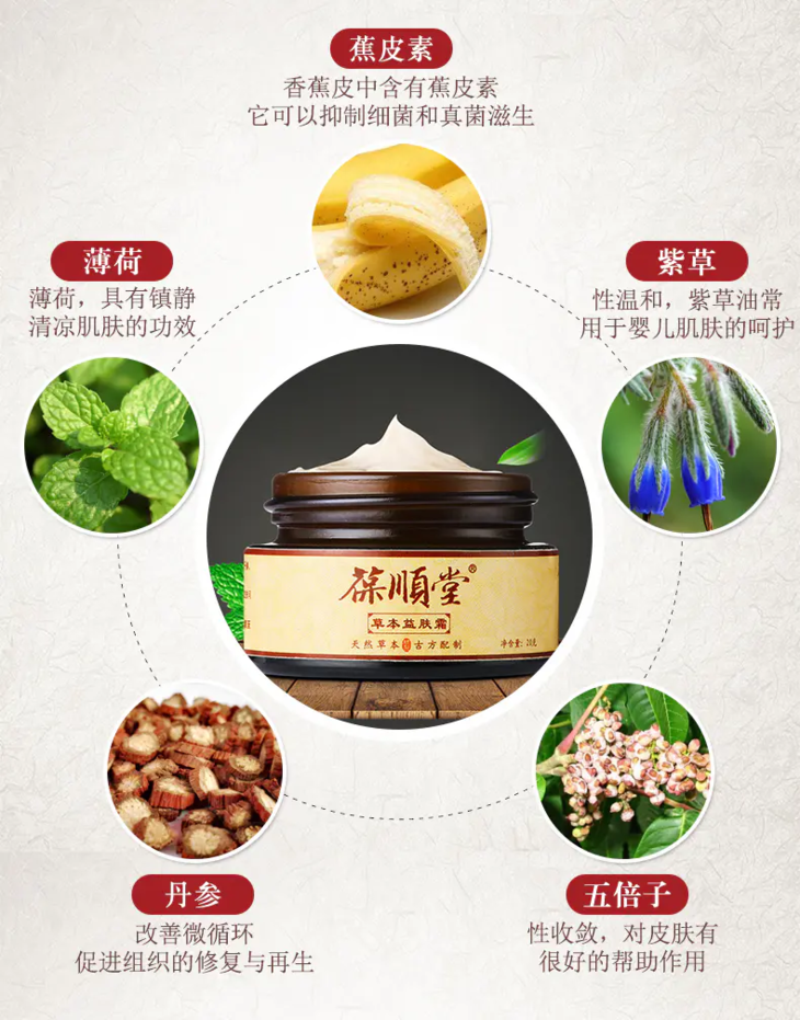 益肤霜配方源自《草本纲目》,由五倍子、紫草、蕉皮素、丹参、薄荷等,经过精心配比萃取而成。