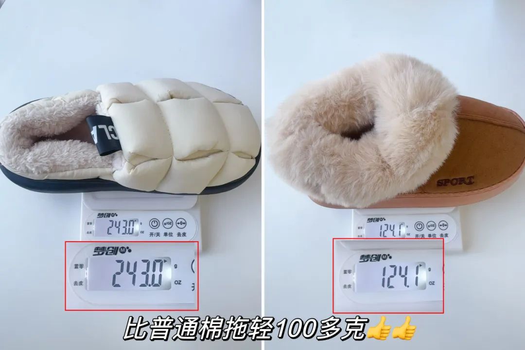 轻到什么程度?轻松演绎一场“水上漂”,而且比普通棉拖鞋能轻100多克!暴走不累脚。