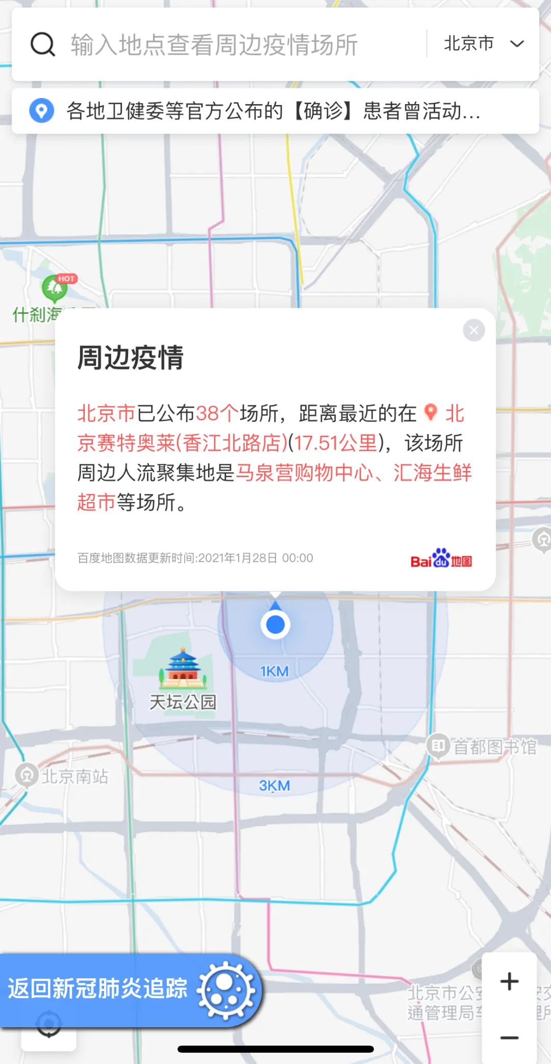 “身边疫情查询”模块,我们和百度地图进行合作,接入百度地图“周边疫情”的搜索功能,该功能不仅能够轻松查看疫情分布情况,点击地点还能够可显示具体信息。