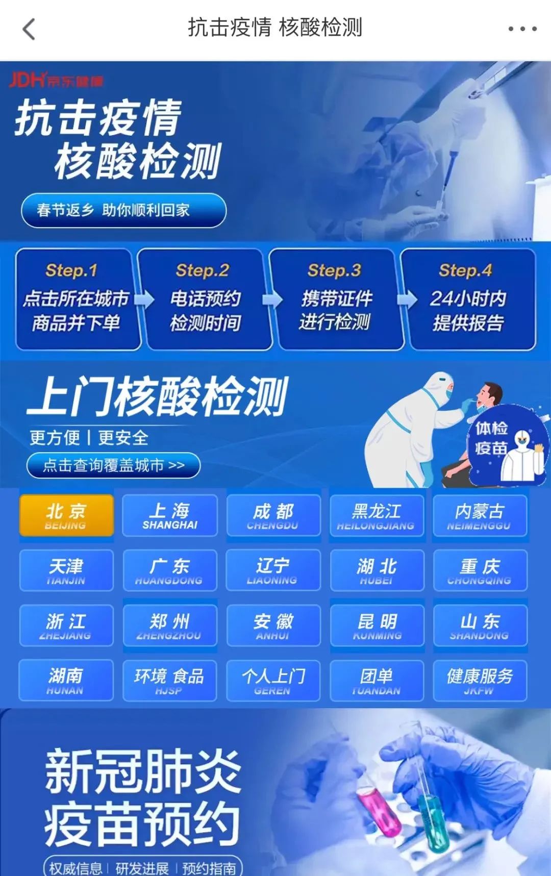 “预约核酸检测”模块,我们和京东健康进行合作,接入京东健康“新冠核酸检测服务”的预约平台,用户通过点击“预约核酸检测”即可跳转到相关页面,购买及预约检测服务。