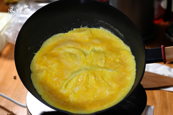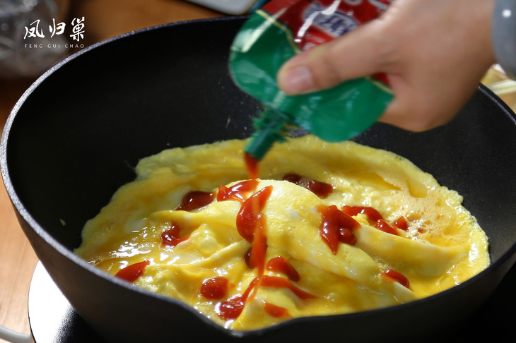 4、 起锅烧油,油热摊鸡蛋,不用翻面,待上层蛋液凝固后倒入番茄沙司,平铺在炒好的米饭上即可食用