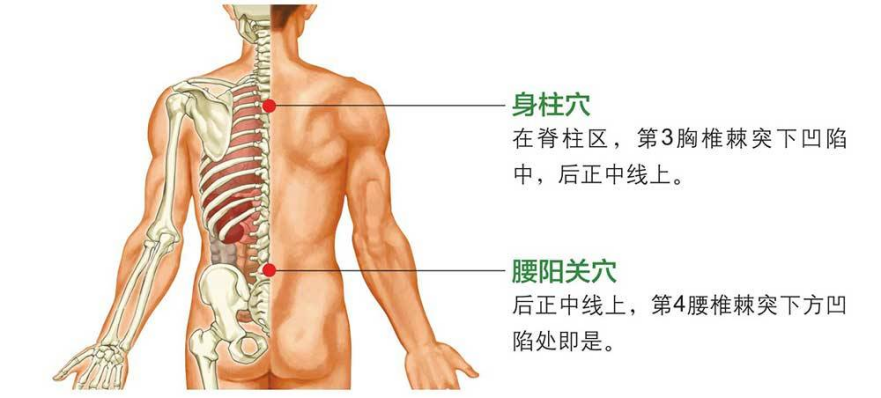 选穴:命门、肾俞、腰阳关、至阳、百会、大椎、神阙(肚脐)、足三里、涌泉穴等。必要时可以在整个督脉上进行督脉灸。