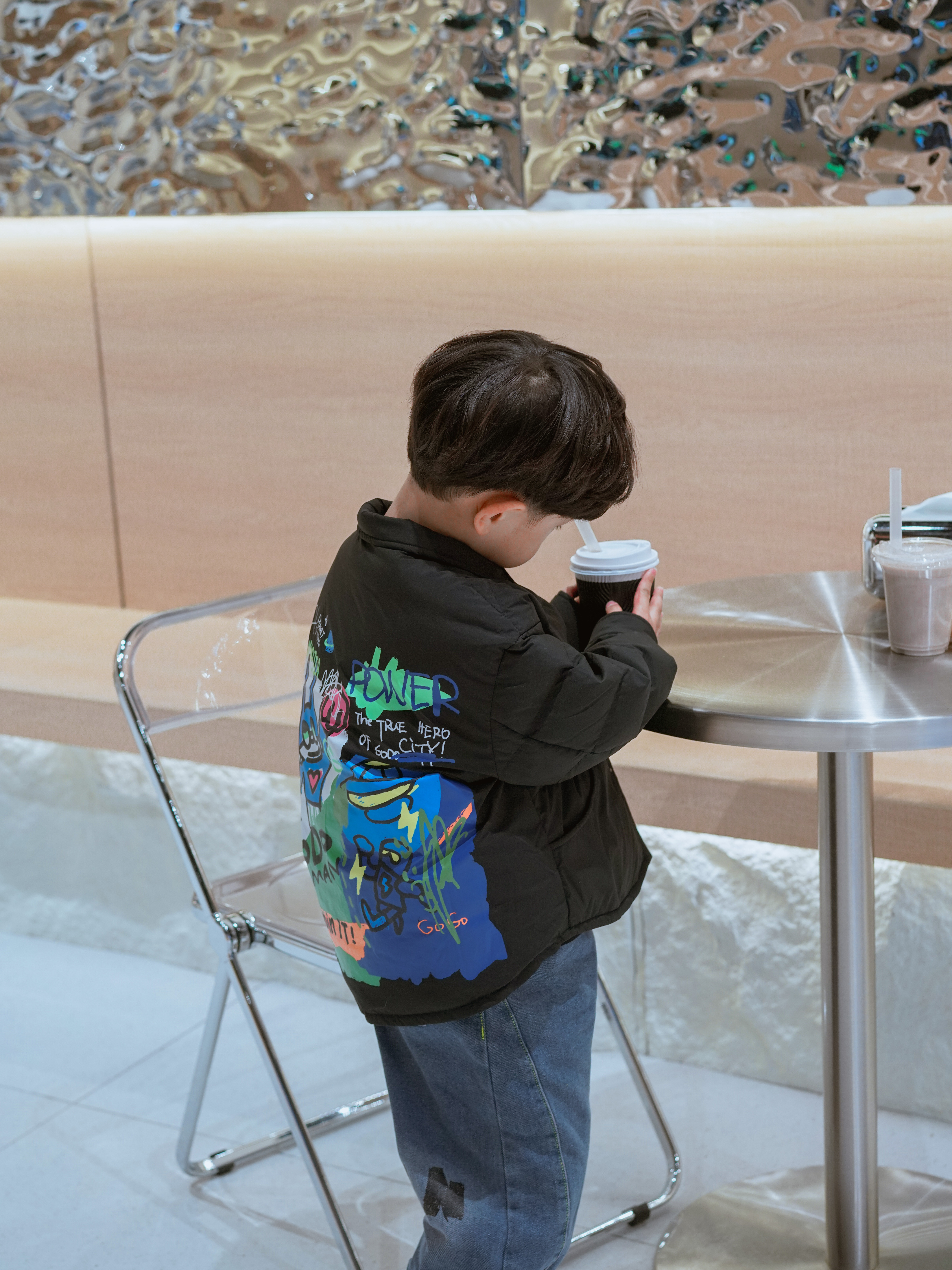 轻盈衬衫式羽绒,不同于干净整洁的前片,后片大面积的艺术感印花图案,色彩新鲜有质感。