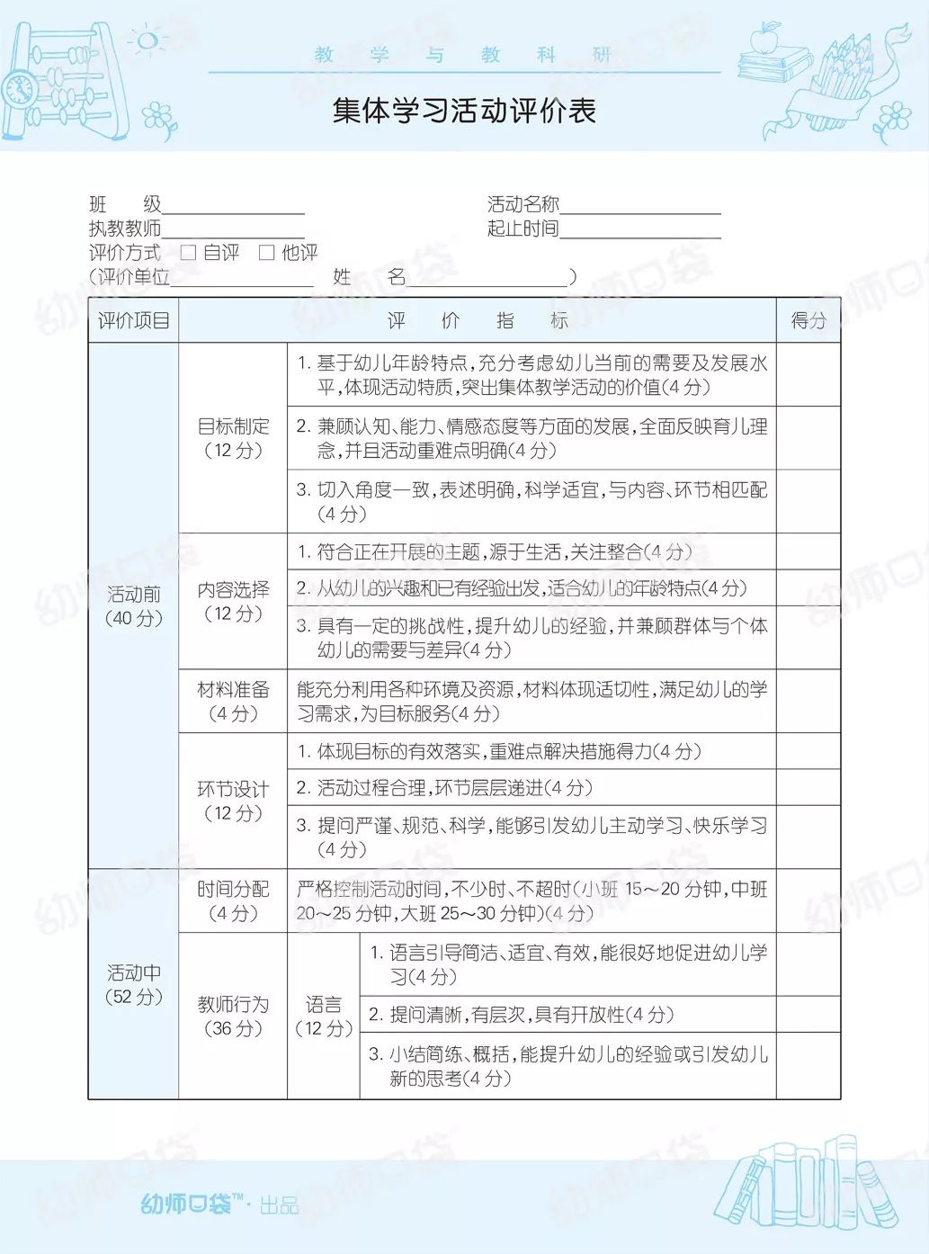 一张细致入微的评价表,对集体活动的目标制定、内容选择、材料准备、环节设计,帮老师看到自己的进步和不足。