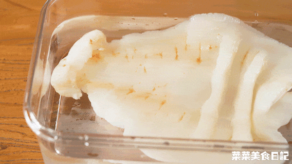 2.蒸好变软的花胶,放入冰的纯净水浸泡12-48小时;