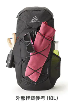 两侧的网兜,分别采用封闭式拉链和开放式网状口袋的不对称设计,配有反光织带环、兼容水袋,22L 及以下采用弹性交叉绳索,可以做到挂载和干湿分离。