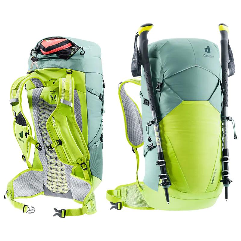前肩带创新设计,多仓收纳,可固定折叠登山杖,而无需卸下背包轻松地拿取装备,稳固不晃动。