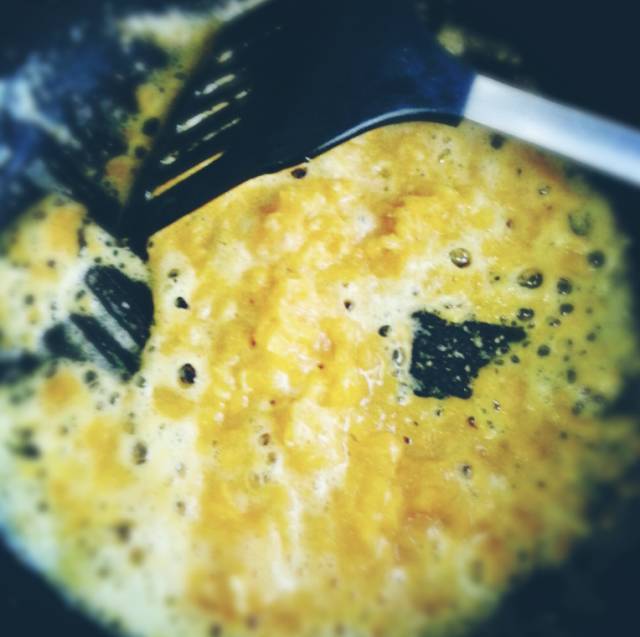 2、豆腐下到锅里,用勺子不断搅拌,把豆腐搅碎,和其他食材融合在一起,开锅以后咸蛋黄会溶解并包裹在豆腐表面,颜色微微发黄;