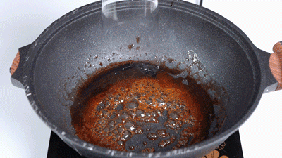 将硬糖、巧克力、火锅底料加热融化,熬一锅浓茶,再把猪肉腌制准备。