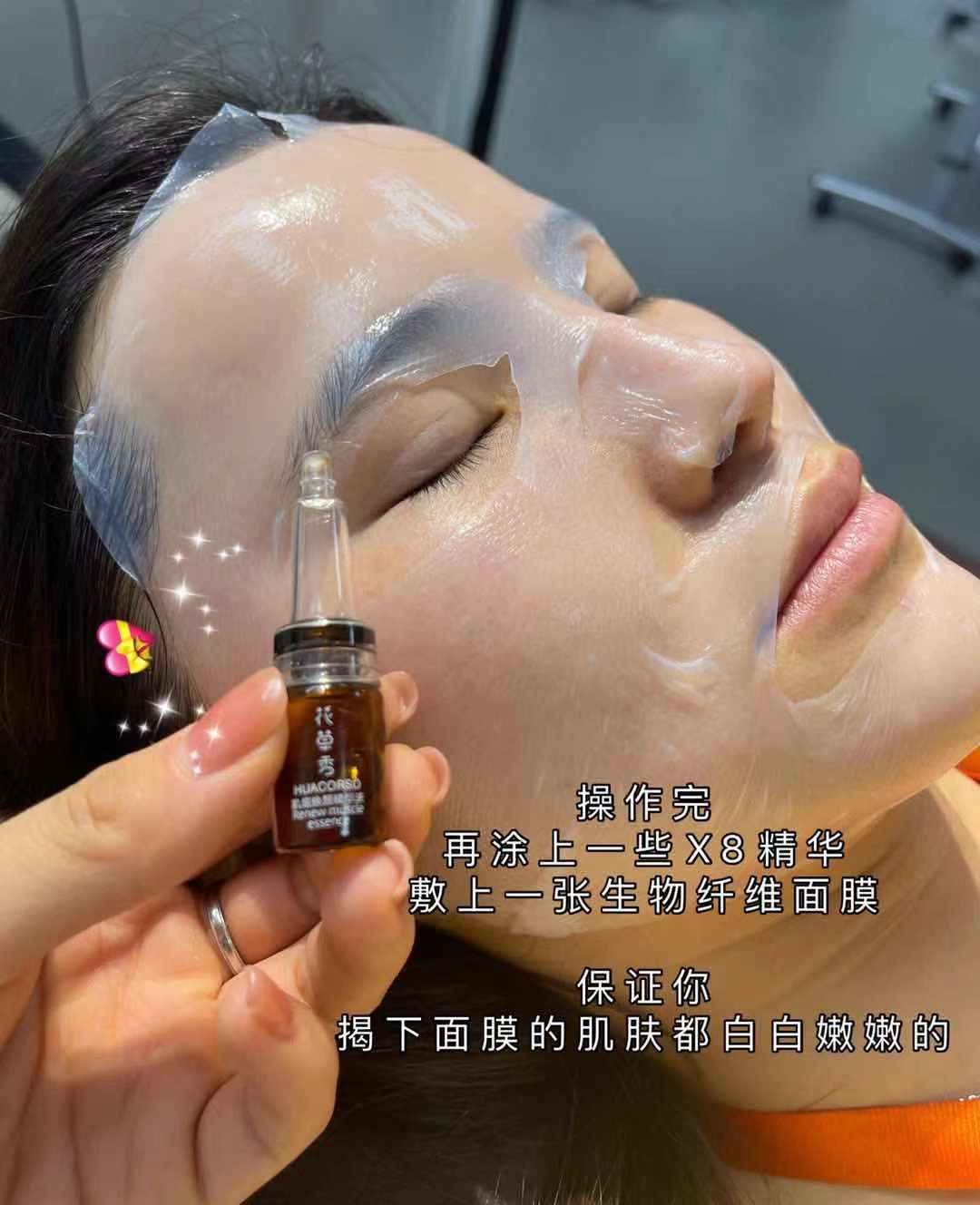 步骤:X8涂上皮肤做打底,敷上面膜,面膜外层继续在斑点严重和想改善肤色的地方,叠加上X8,根据自己适合的时间(敷上10-30分钟)揭下面膜,能明显发现皮肤白透很多。