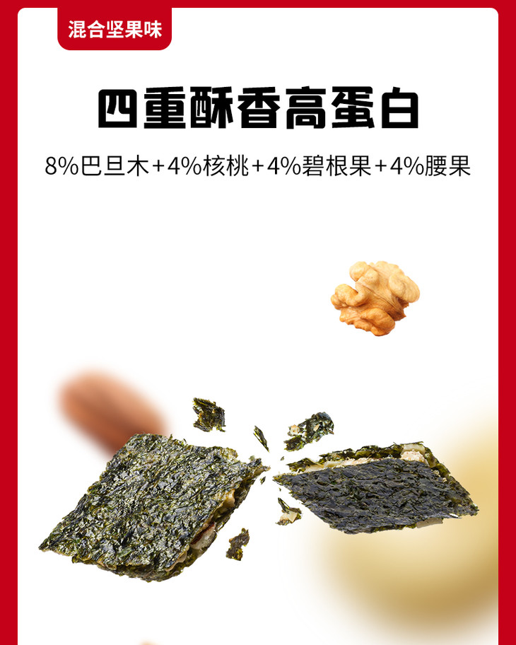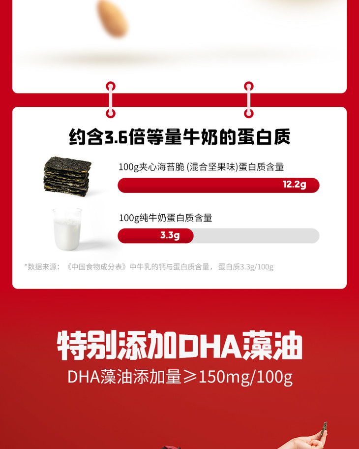 ②每100g夹心海苔脆(混合坚果味)约等3.6倍100g纯牛奶蛋白质含量;