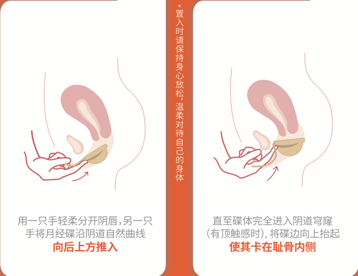 如果感觉到疼痛或者放入式感觉有阻力放不进去,很可能是姿势不太对,记住月经碟进入的方向是斜向上,就是朝着你屁股的方向推入!