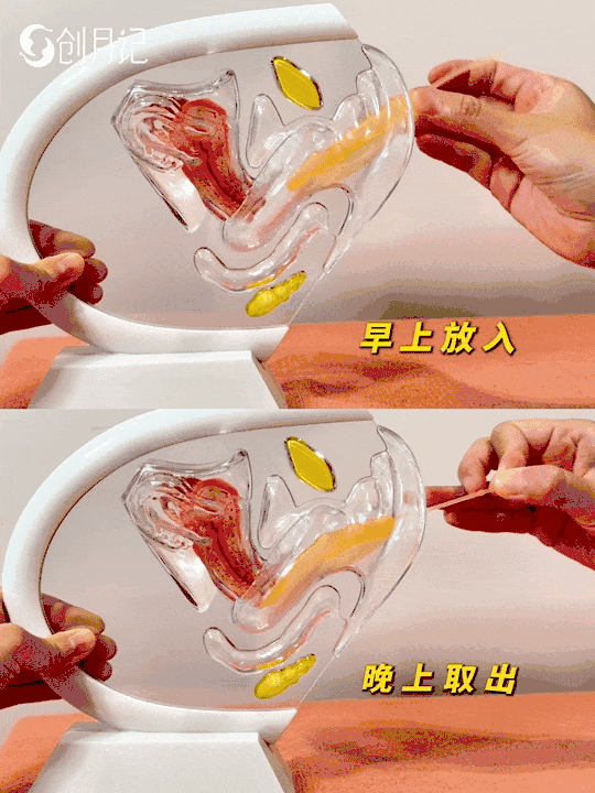 也就是在上厕所时,使一点力气挤压盆底肌,月经碟就会受到挤压,经血就能排出来。这在量大的日子非常好用,尤其是晚上。