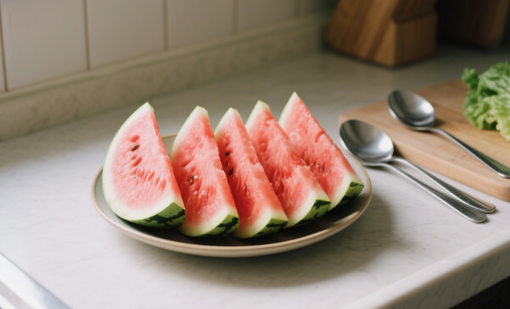 抱着半个西瓜用勺子挖,不知不觉就会吃过量。正确做法是:提前切块分量,只取计划食用的部分,避免超量。