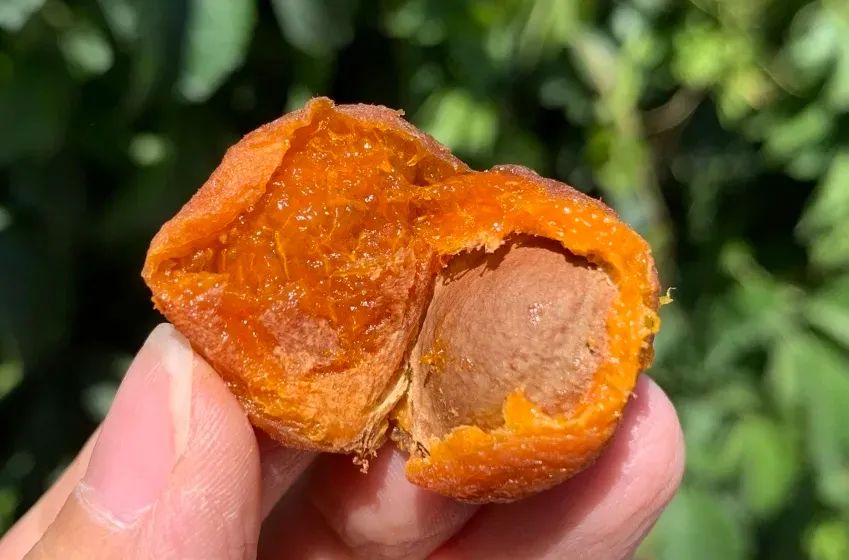 当时我们还留了一部分杏在树上继续风干,就是在等着它的究极进化。到了10月,吊干杏已经在树上风干浓缩成了蜜饯状态,果肉变得像蜜糖般粘稠,呈现出“胶质”感,让人疯狂心动。