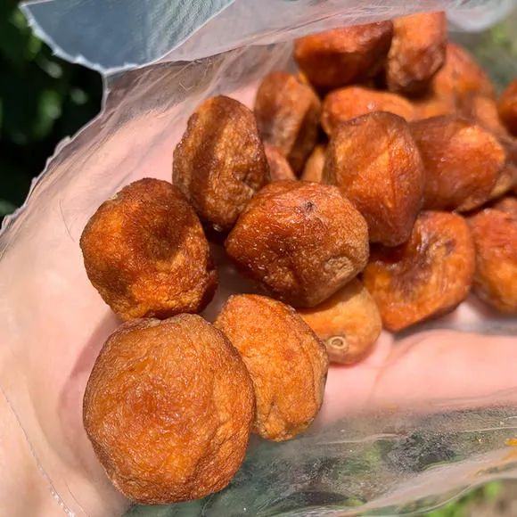 吊干杏风干后,果肉会有点泛棕、泛黑。杏肉越黑,糖分积累越多,吃起来就是一颗杏子软糖本糖。不是傻甜,而是带着浓浓杏味的甜,不会觉得腻。