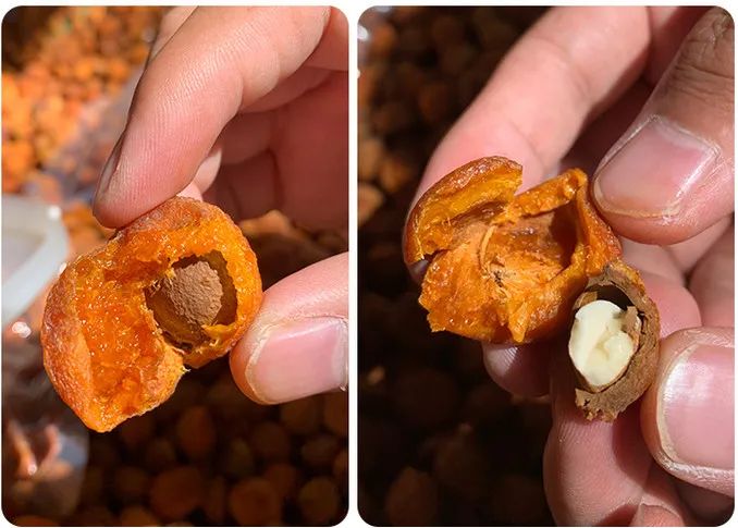 吃完吊干杏的果肉后,这场甜蜜大戏还没有结束。咬开或者锤开杏核,可取杏仁食用,杏仁酥脆香浓,还带着一股独特的清香。