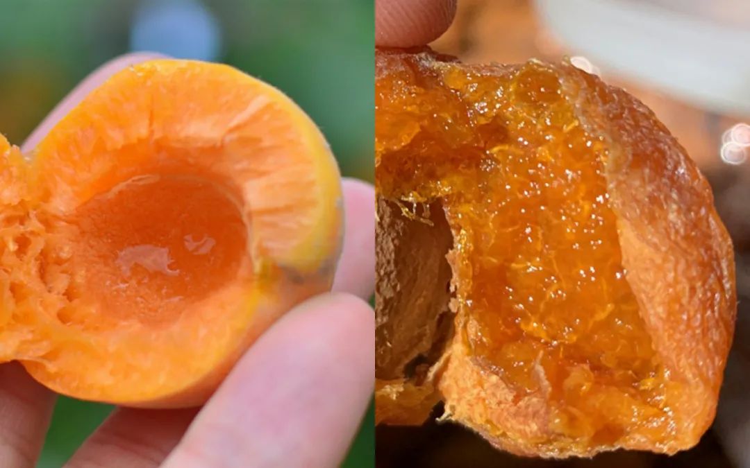 带大家回顾一下吊干杏鲜果的糖度——21度,已经是秒杀大部分水果的程度。在阿克苏,当地人会把吊干杏称为“树上的红色蜂蜜”,而现在更干的吊干杏,相比鲜果,甜感更加纯粹和浓郁,可以说是“树上的红色蜂蜜升级版”。