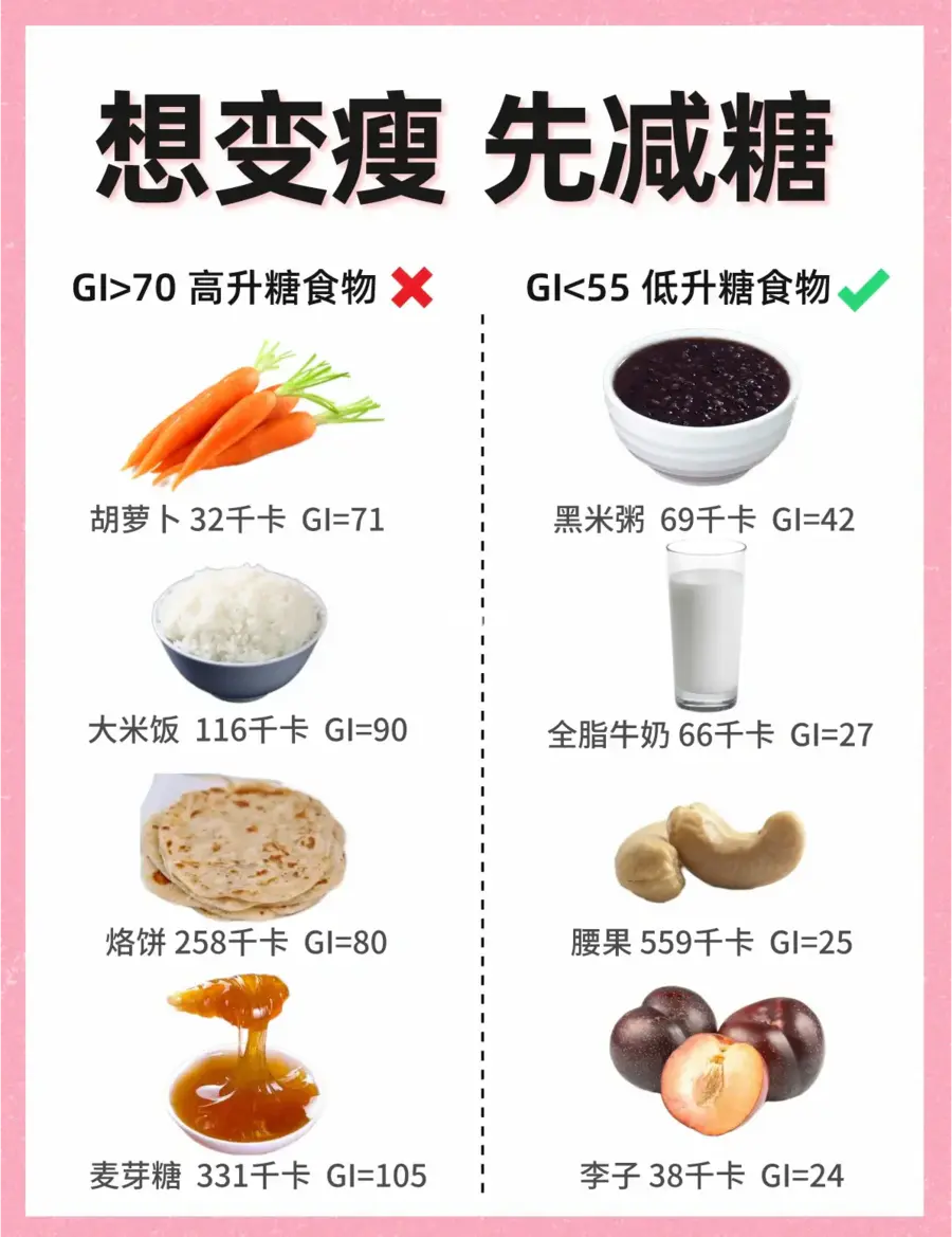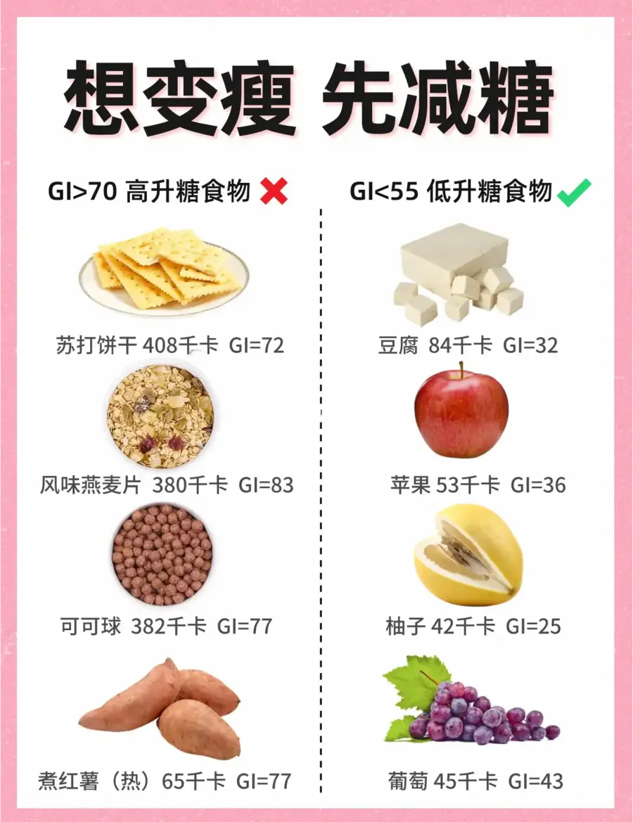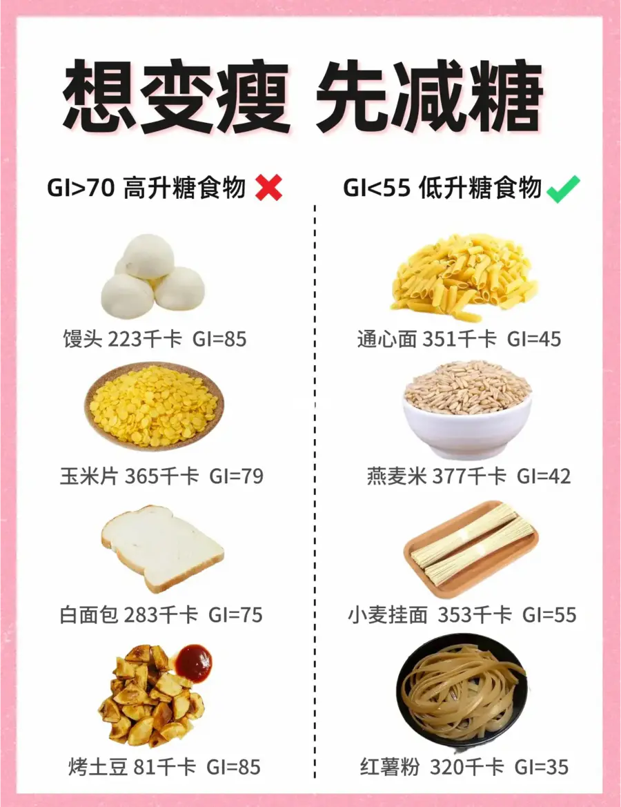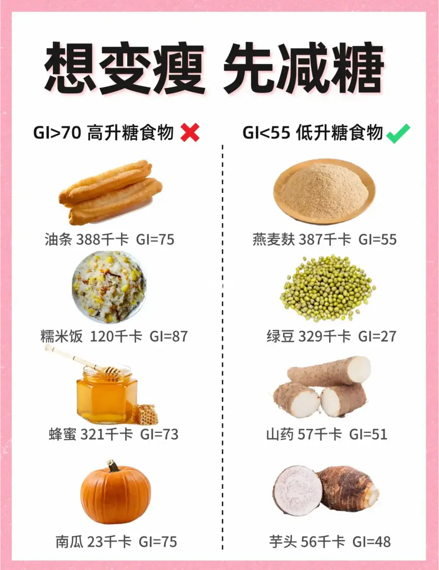 减脂期除了控制热量之外,还需要了解食物的升糖指数(GI),优先进食低升糖食物,不仅对减脂有帮助,还能预防因血糖波动造成的饥饿感,使食欲更平稳哦~孕期控糖同样适用