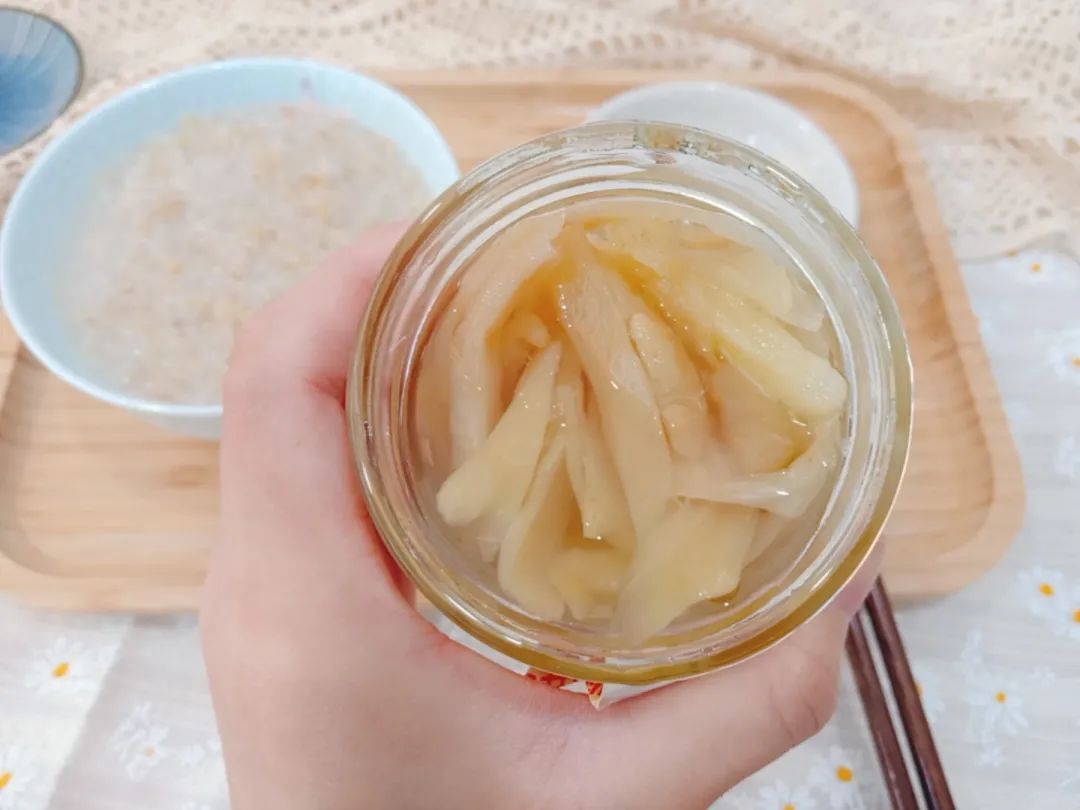 自从有了它,每天喝粥的时候,夹出来3、4根当小菜,酸甜中带有一丝丝柔和的辛辣感,熨帖的肠胃很舒服!