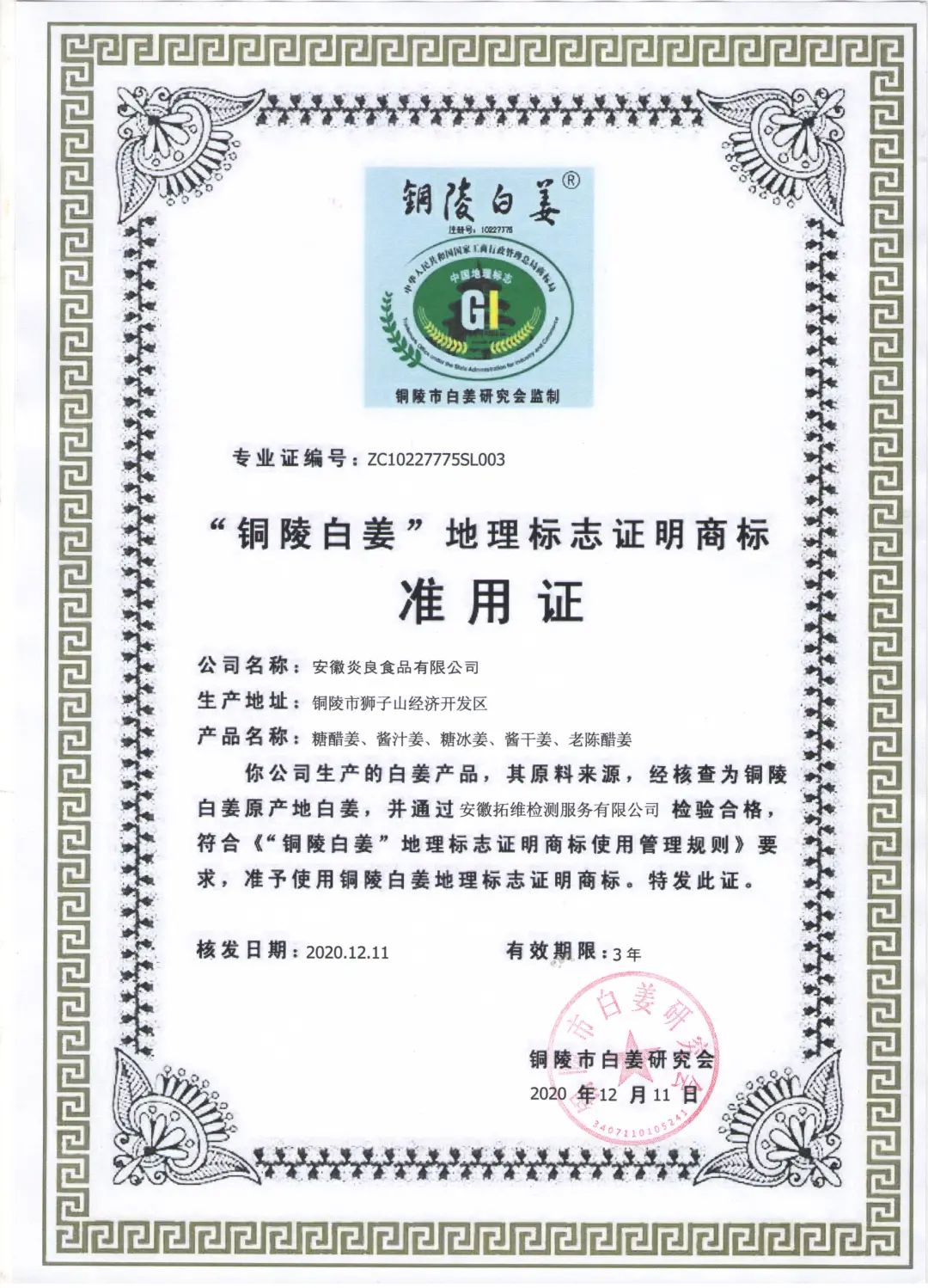 厂家申请并获得了“铜陵白姜地理标志证明商标准用证”。让大家放心吃到地道的铜陵白姜。
