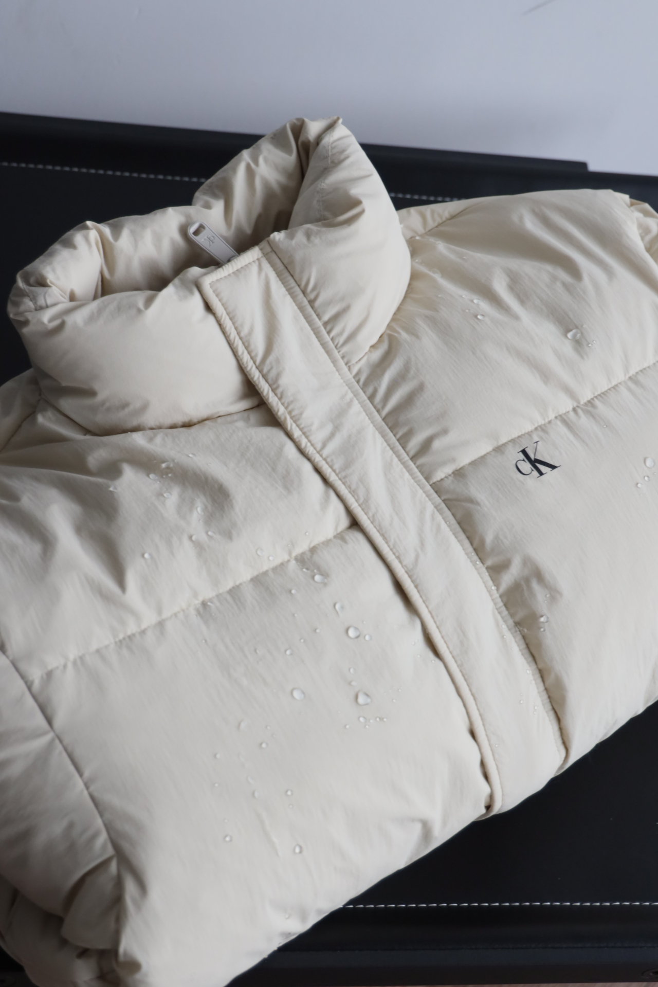 春秋款,超轻型面料阳光下能看到不同光感,聚氨酯涂层具有疏水性,防风防水,臂膀侧边深蓝色系三角金属徽标,衣身藏蓝色