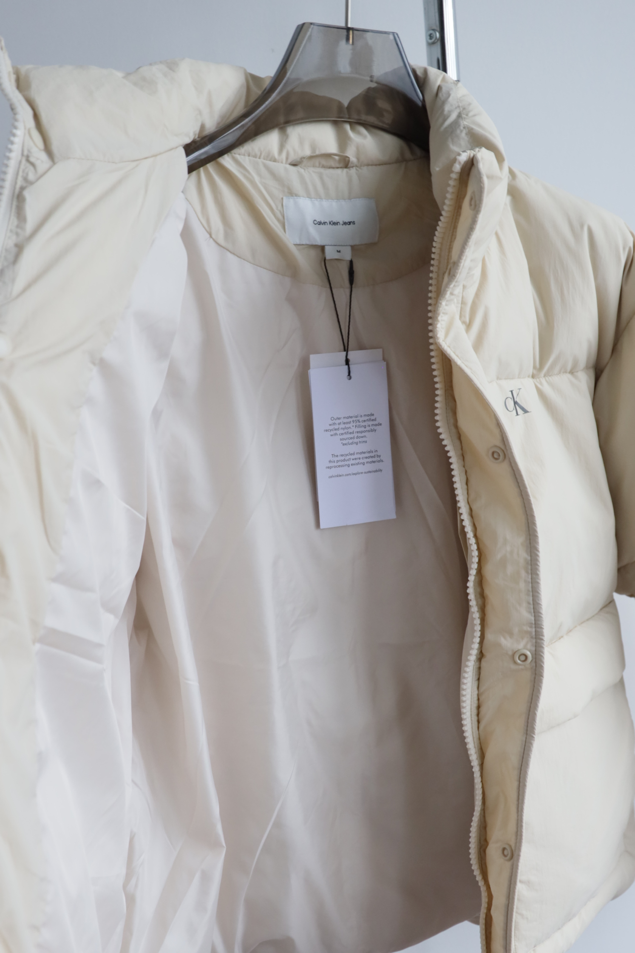 此款夹克外套使用再生尼科技面料制成,表面整洁光滑且富有光泽,上身舒适轻盈