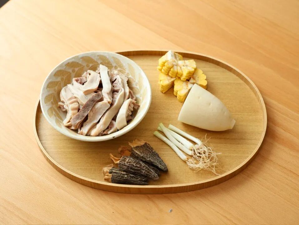 ② 剩下食材洗干净,白萝卜去皮切滚刀块,玉米切小段,羊肚菌温水泡发(泡发的水不要倒,一起炖汤超鲜的);