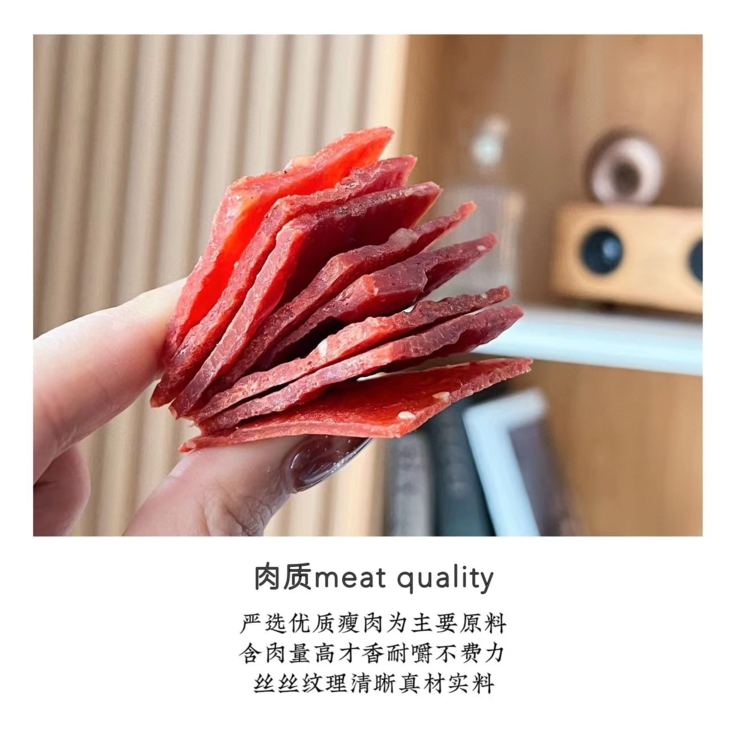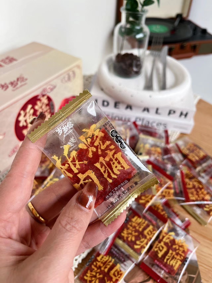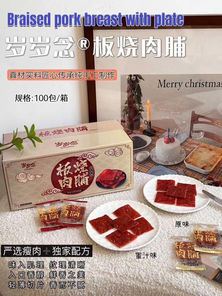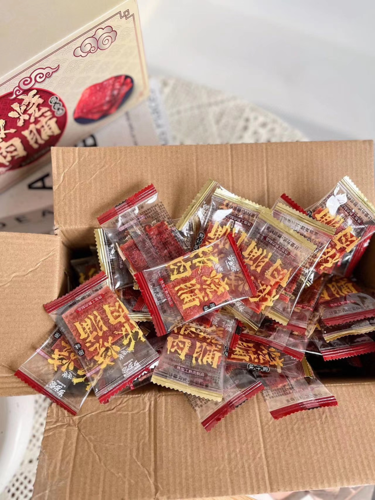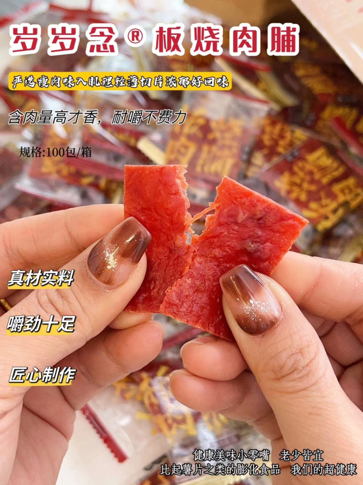 🔥【岁岁念猪肉脯】💰29.9元/约100包‼️一块嚼上瘾的靖江特色!肉质紧实,有嚼劲;纹路清晰,有撕咬;真肉本身,高颜值🥳 新鲜🥓猪肉,高温熟化,碳火烧制,未见其形,先闻其香,上口干而不柴;精选后腿肉,刷新美味上限🔝
