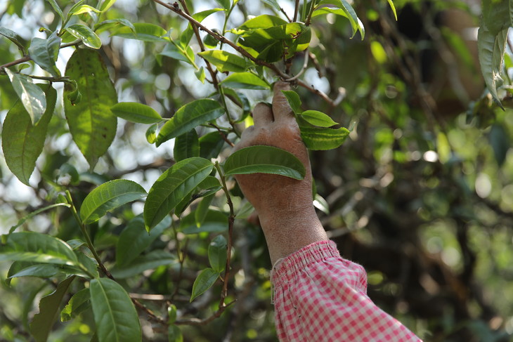 看到她们是怎么把茶树枝枝上的多余芽叶摘掉,又怎么留着顶端的芽叶。
