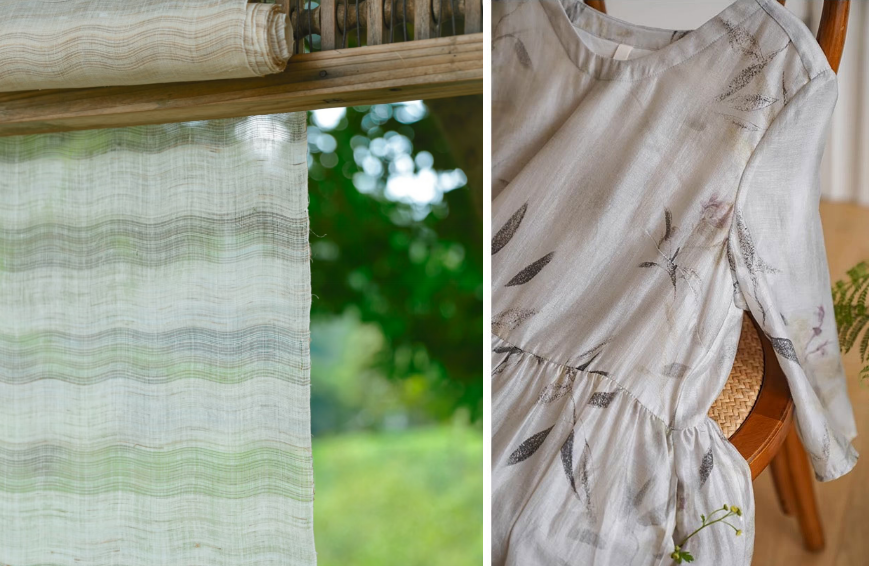苎麻的纤维长、强度好、手感坚韧结实,织出来的面料挺括度很好,轻柔有风骨,不容易垮塌没型。