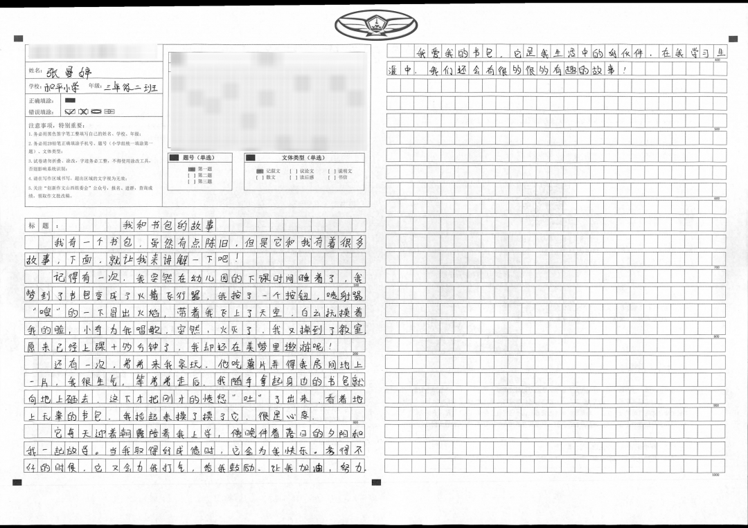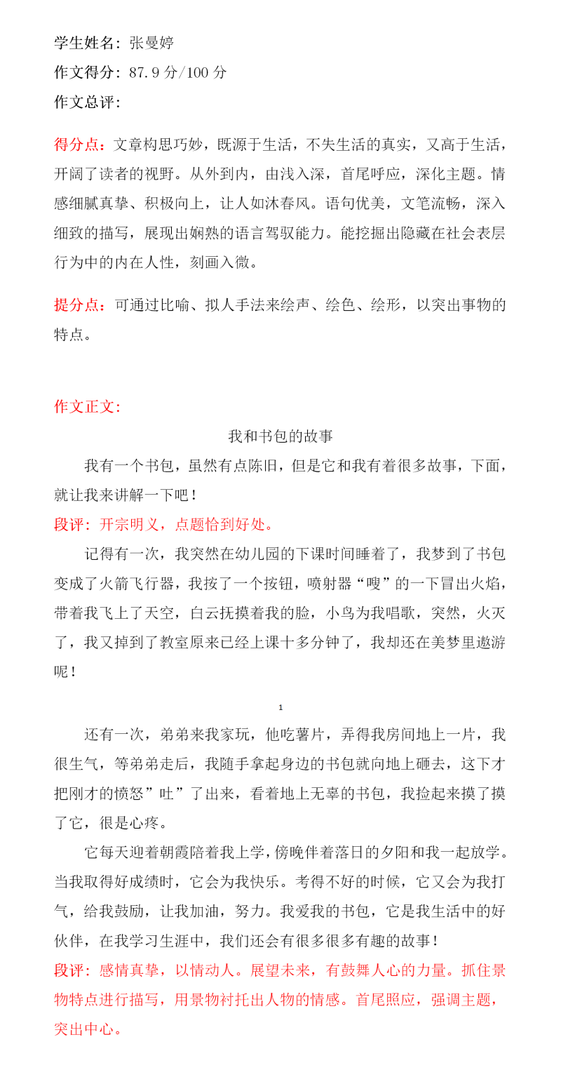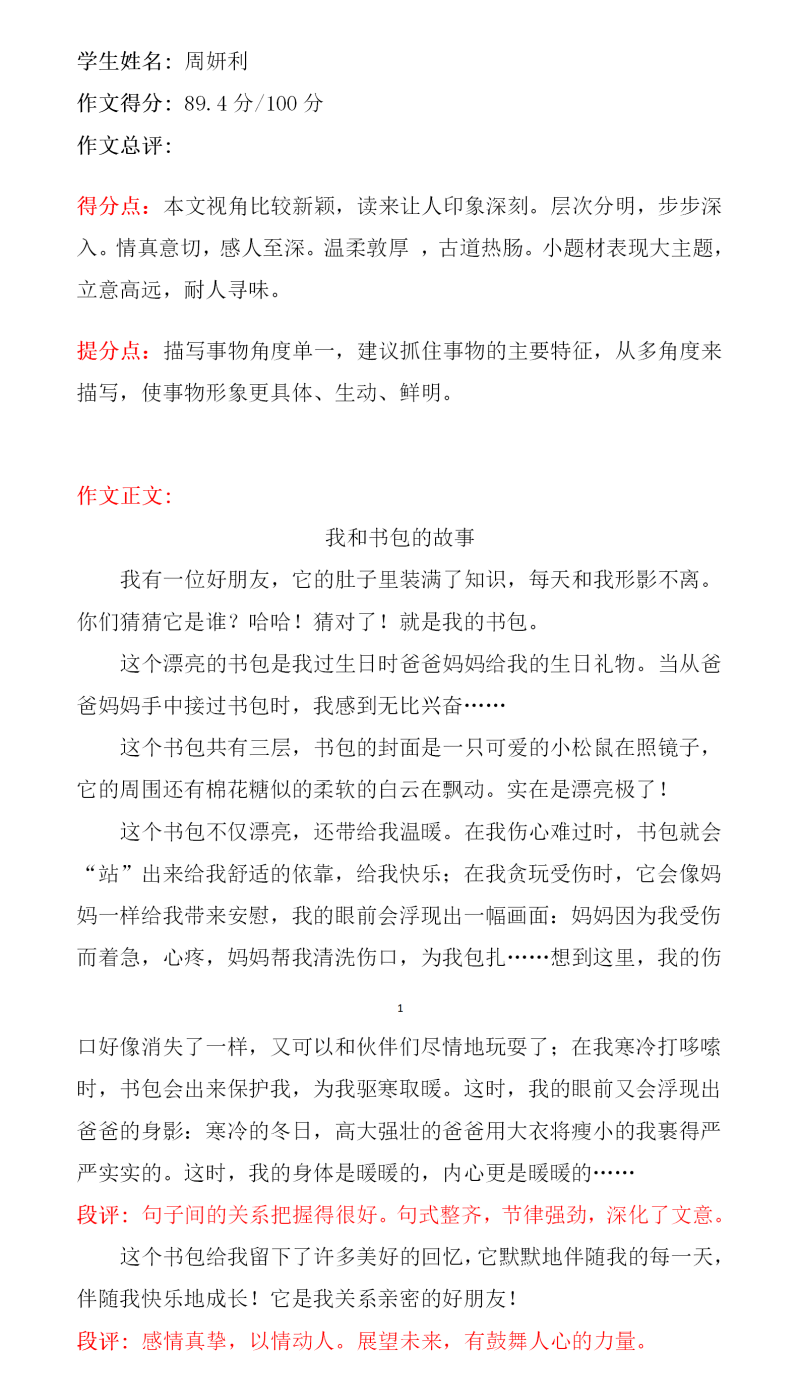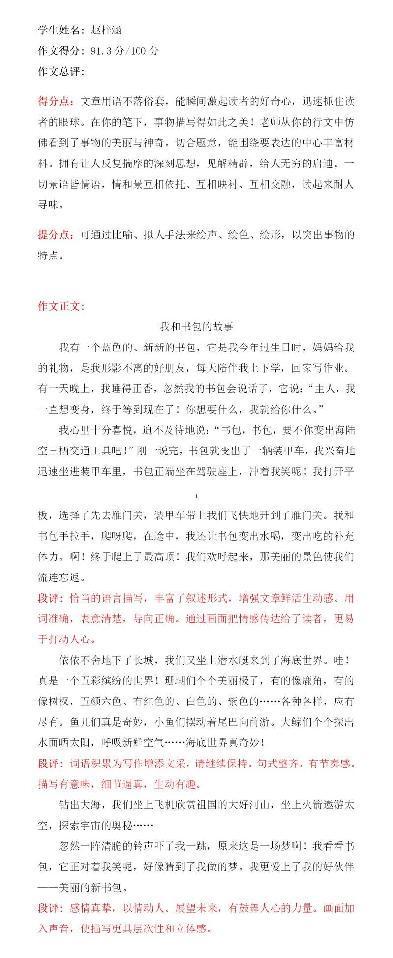 书包是成长过程中一直陪伴“我”的好朋友,好伴侣,见证“我”学习过程中的喜怒哀乐。这次习作,你乘着想象的翅膀,带我们进入你与书包的世界,真是乐趣无限。希望你能在写作的殿堂中继续展翅高飞。