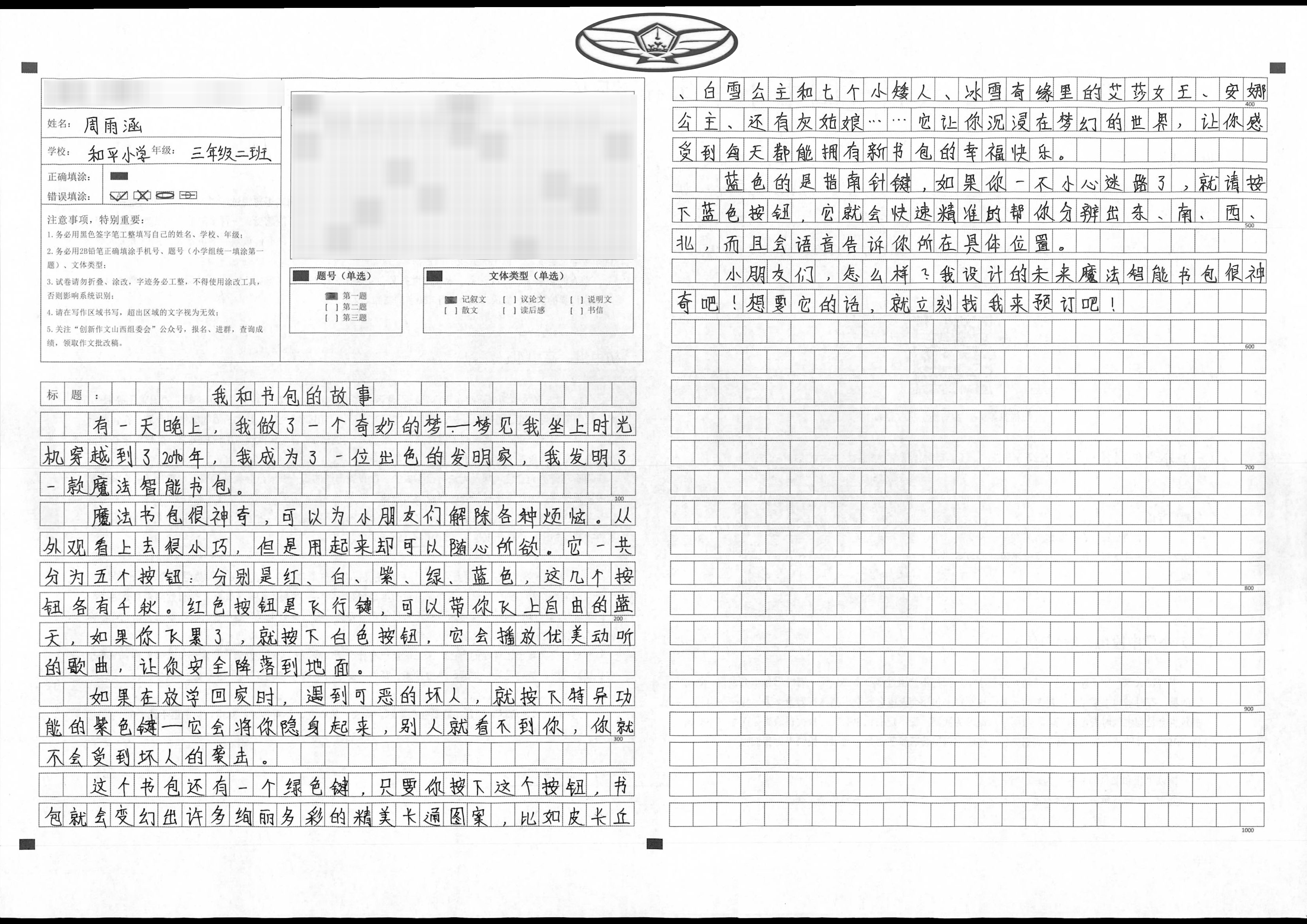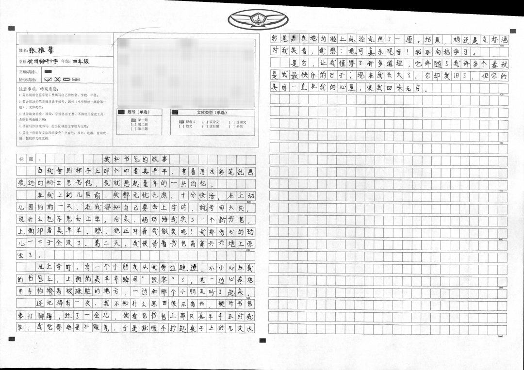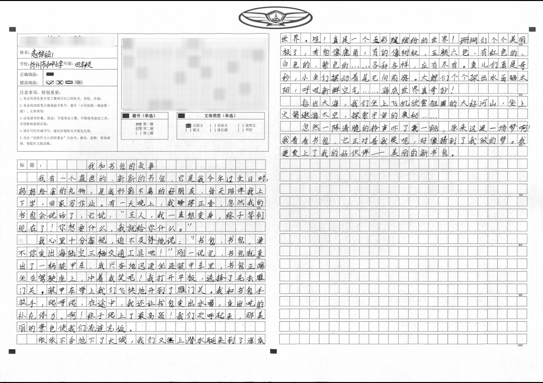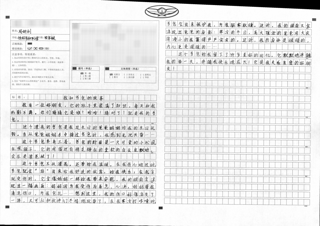 书包是成长过程中一直陪伴“我”的好朋友,好伴侣,见证“我”学习过程中的喜怒哀乐。这次习作,你乘着想象的翅膀,带我们进入你与书包的世界,真是乐趣无限。希望你能在写作的殿堂中继续展翅高飞。