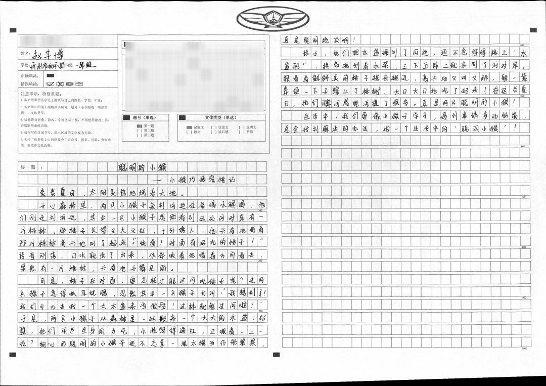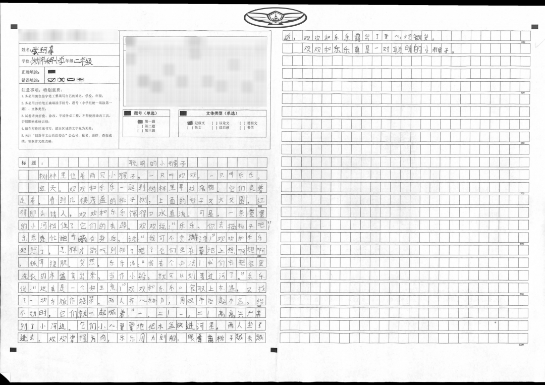 看到图片时,孩子眼前一亮,迅速口述出了两只小猴想办法吃桃子的故事,非常生动有趣,我们鼓励孩子把自己想到的写了下来,就是这篇作文。孩子纯真的世界像小猴子般可爱,我们愿保留她的“真”!